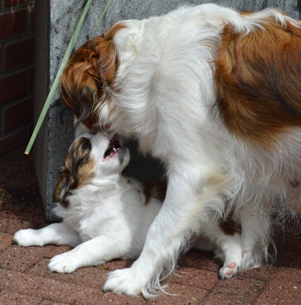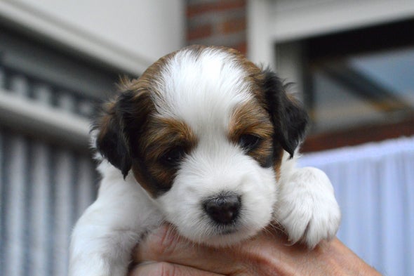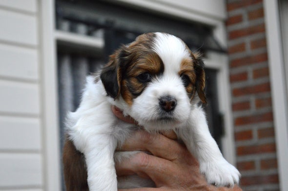 Met het socialiseren gaat het ook steeds beter, mensen vindt hij geweldig, maar bij de honden kijkt hij eerst de kat uit de boom.