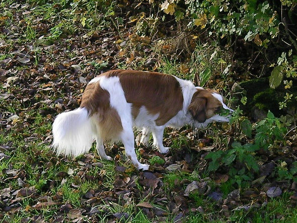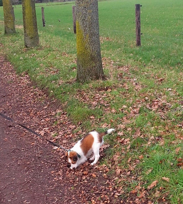 Hij doet steeds vaker een poging om zijn pootje op te tillen om te plassen daarbij wankelt hij van de één op de andere poot en twijfelt of hij links of rechts om zal plassen.