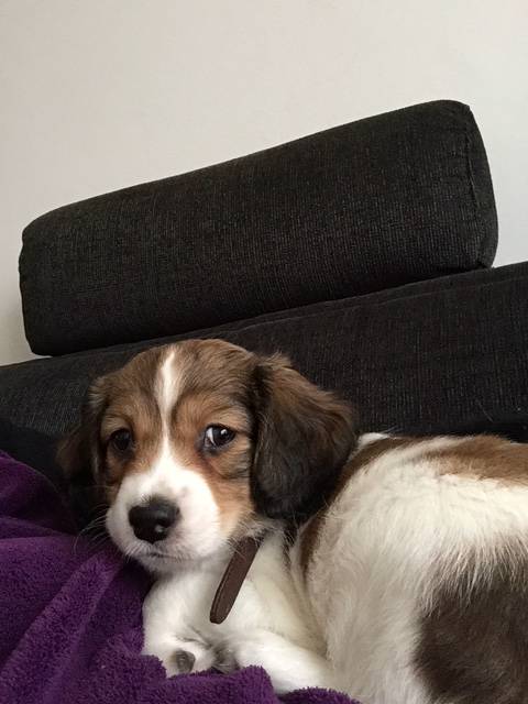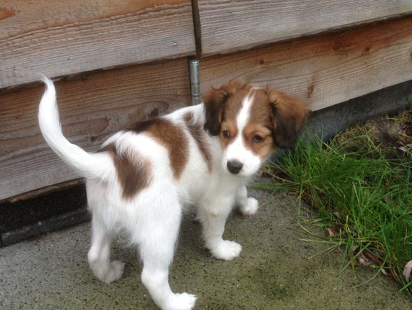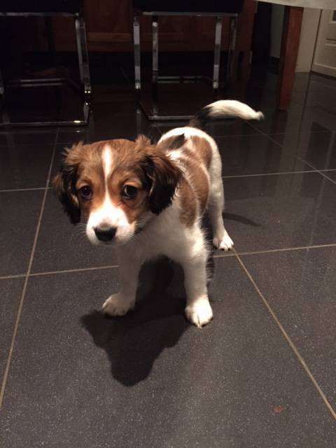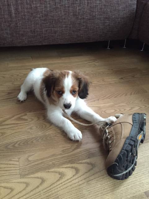 Hij is zindelijk maar vindt het nog niet nodig het duidelijk aan te geven...hij kan goed alleen op het huis passen en is ontzettend lief, gezellig, boevig en slim! Hij kan goed puzzelen, pootje en high five geven en leert veel op puppycursus. Aan de riem lopen gaat al heel behoorlijk, maar ja, andere honden, mensen, blaadjes, takjes enz.enz. zijn ook erg leuk...