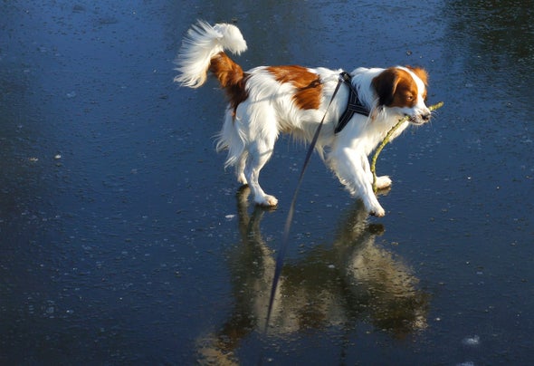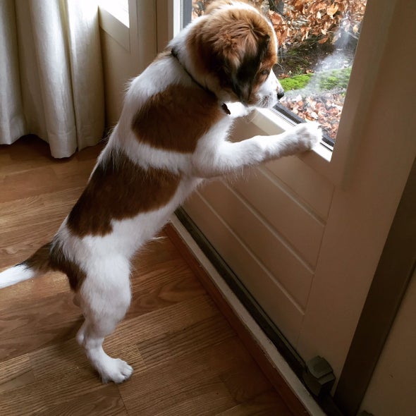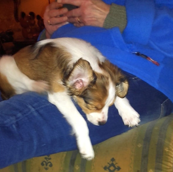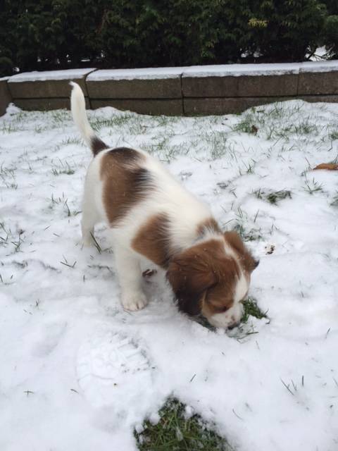 "Het gaat goed met Toby! Twee nachten wat gehuild om moeder, broertjes en zusjes en toen was het klaar. Hij heeft de eerste puppyles al gehad en enorm gespeeld daar. Hij doet het meeste buiten, eet en drinkt goed en vindt de sneeuw geweldig! Mijn schoenveters ook als hij de kans krijgt .