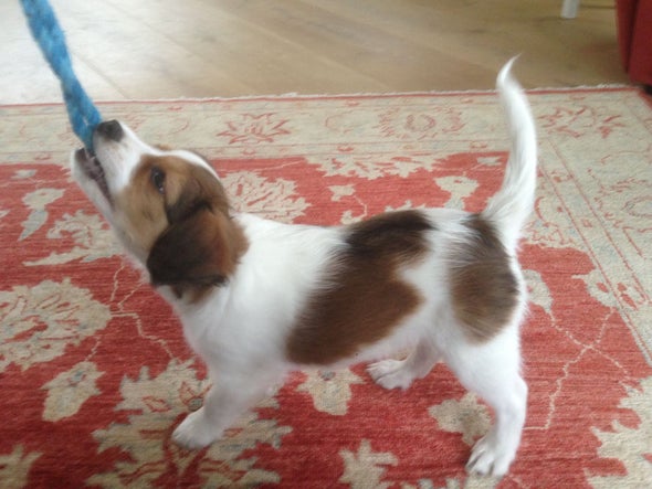 Het gaat goed met Jada. Ze speelt heel veel en het touwtje is haar favoriet. Ze begint er al echt aan te trekken.