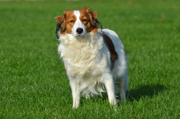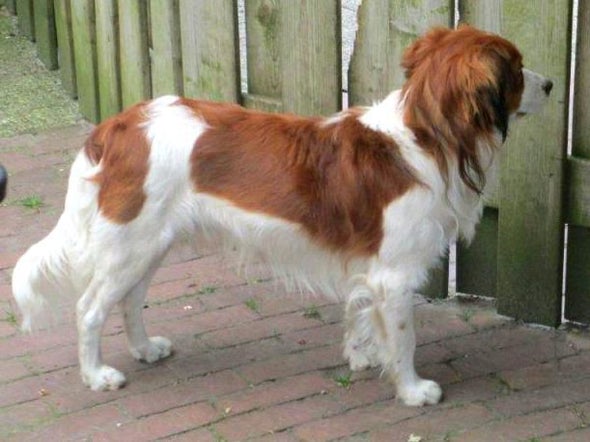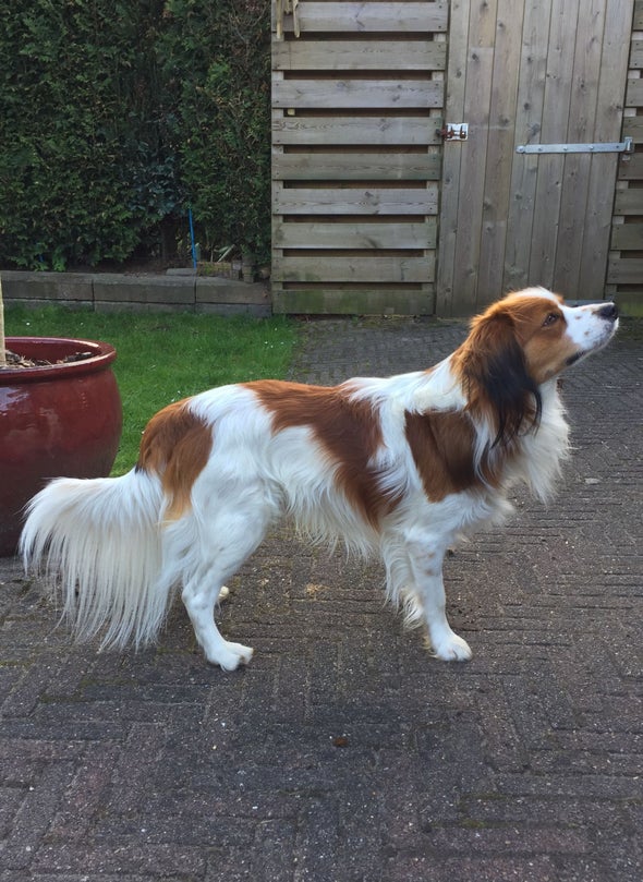 Hij is uitgegroeid tot een hele leuke hond, een flinke reu van 14,5 kg, ongeveer 45 cm hoog met een enorm lief karakter.