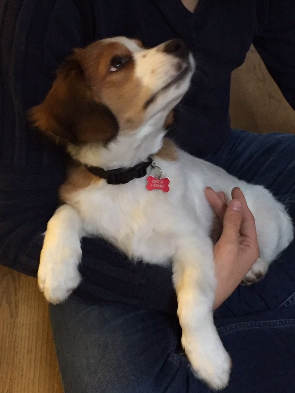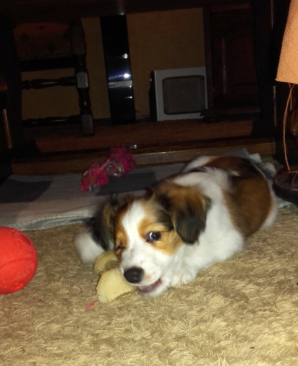 Hij begint nu lekker te puberen en is heel vrolijk, speelt veel met andere honden hoewel hij grote honden soms wat eng vindt.