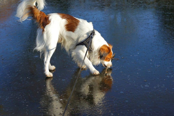 De slootjes en vijvertjes trekken zijn aandacht en heel voorzichtig gaat hij met zijn pootjes het water in om met zijn ene pootje te plompen en naar een takje te happen.