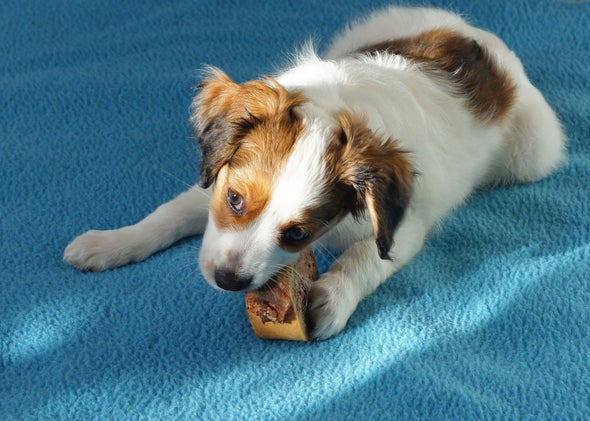 Hij is gek op de 'worstjes' en vindt een gevulde kong leuk maar echt iets eruitkrijgen is nog wat lastig dus wat brokjes erin gaat makkelijker."